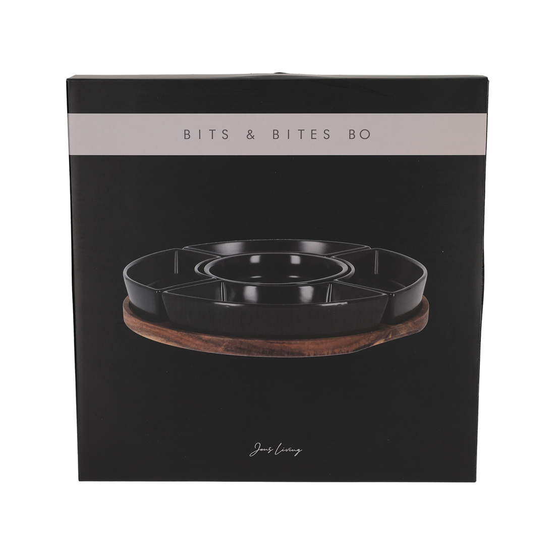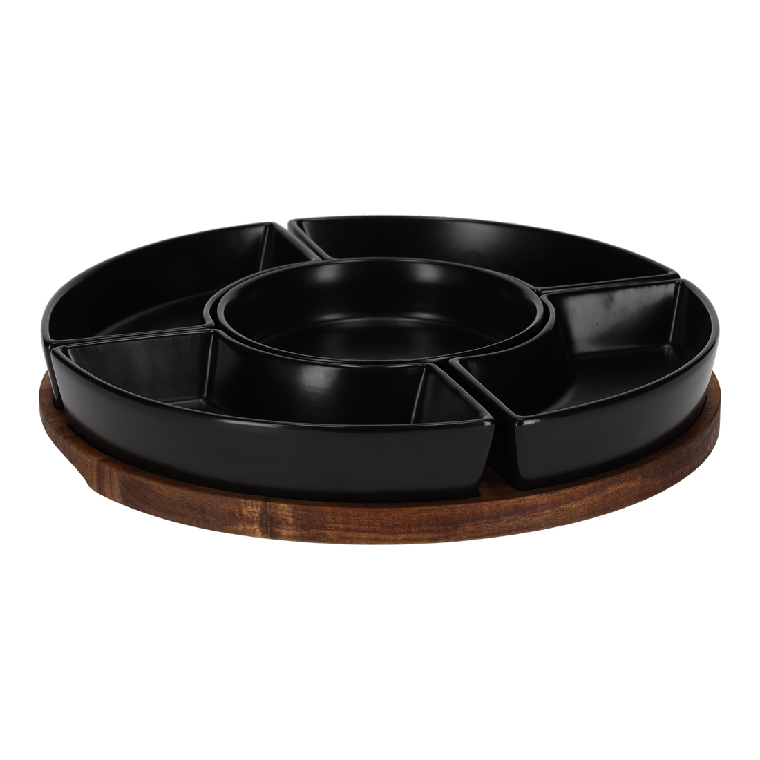 Met dit extra grote dienblad wordt ieder feestje een succes. Het ronde dienblad van acaciahout is voorzien van vijf keramieken bakjes, die gebruikt kunnen worden voor het serveren van snacks en dips. Door de inkepingen in het plankje blijven de schaaltjes goed op hun plek en kunnen deze niet verschuiven tijdens het optillen van het dienblad.