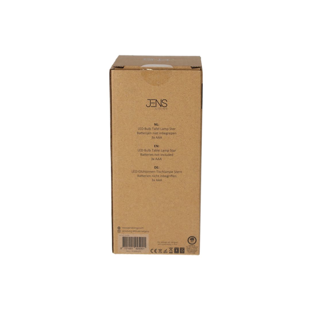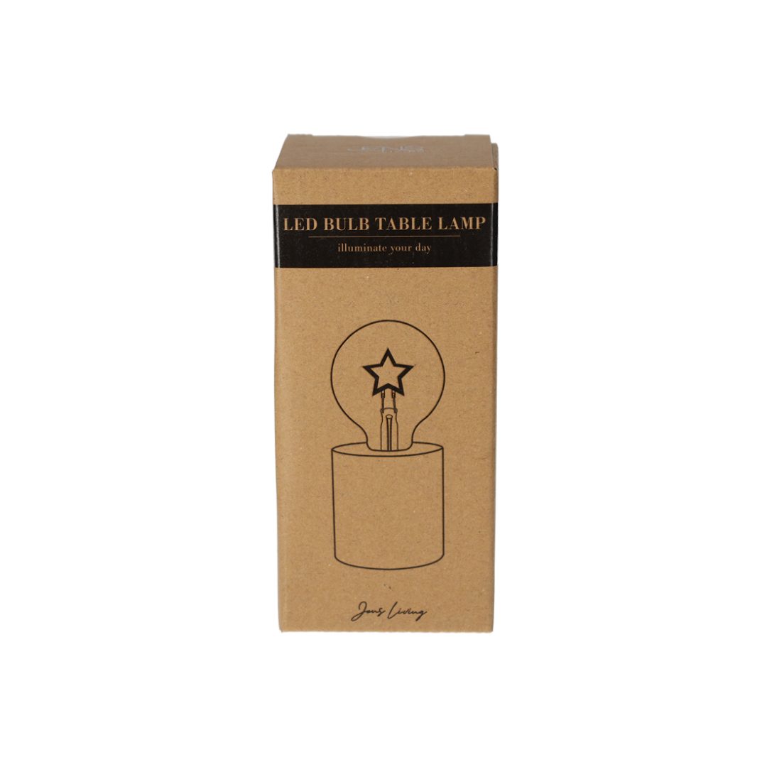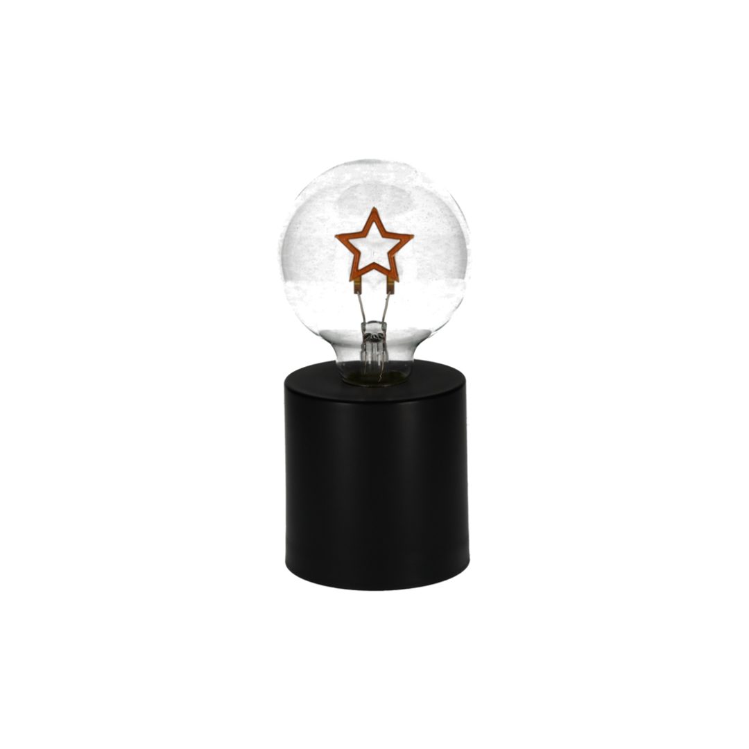 Met deze tafellamp haal je de sfeer van een ouderwetse gloeilamp in huis, maar dan in een modern LED jasje. De gloeidraden zijn in de vorm van een ster. Met de schuifknop op de onderzijde kan het licht worden ingeschakeld. Benodigd: 3 x AAA batterijen (niet inbegrepen).
