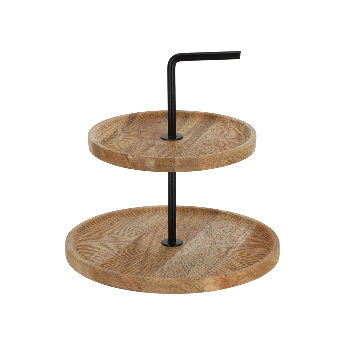Deze leuke etagère heeft twee ronde etages van mango hout. De lagen worden verbonden door een metalen tussenstang met aan de bovenkant een handvat voor een fijne houvast. De etagère kan gebruikt worden om borrelhapjes op te serveren of als accessoire in je interieur.